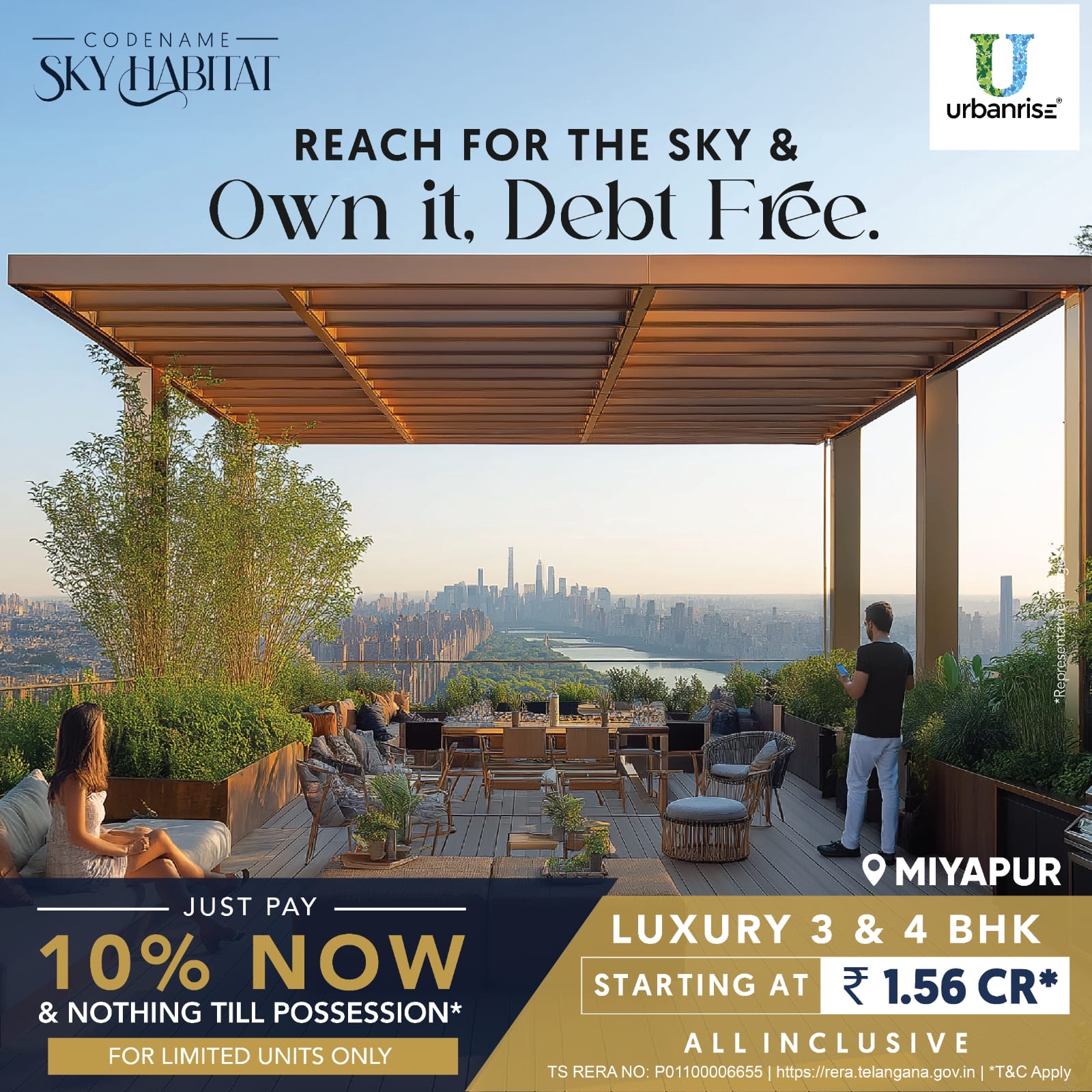 Codename Sky Habitat at Miyapur offers luxury 3 & 4 BHK homes with no loans & no EMIs till possession. Starting at ₹1.56 Cr. Limited units available.